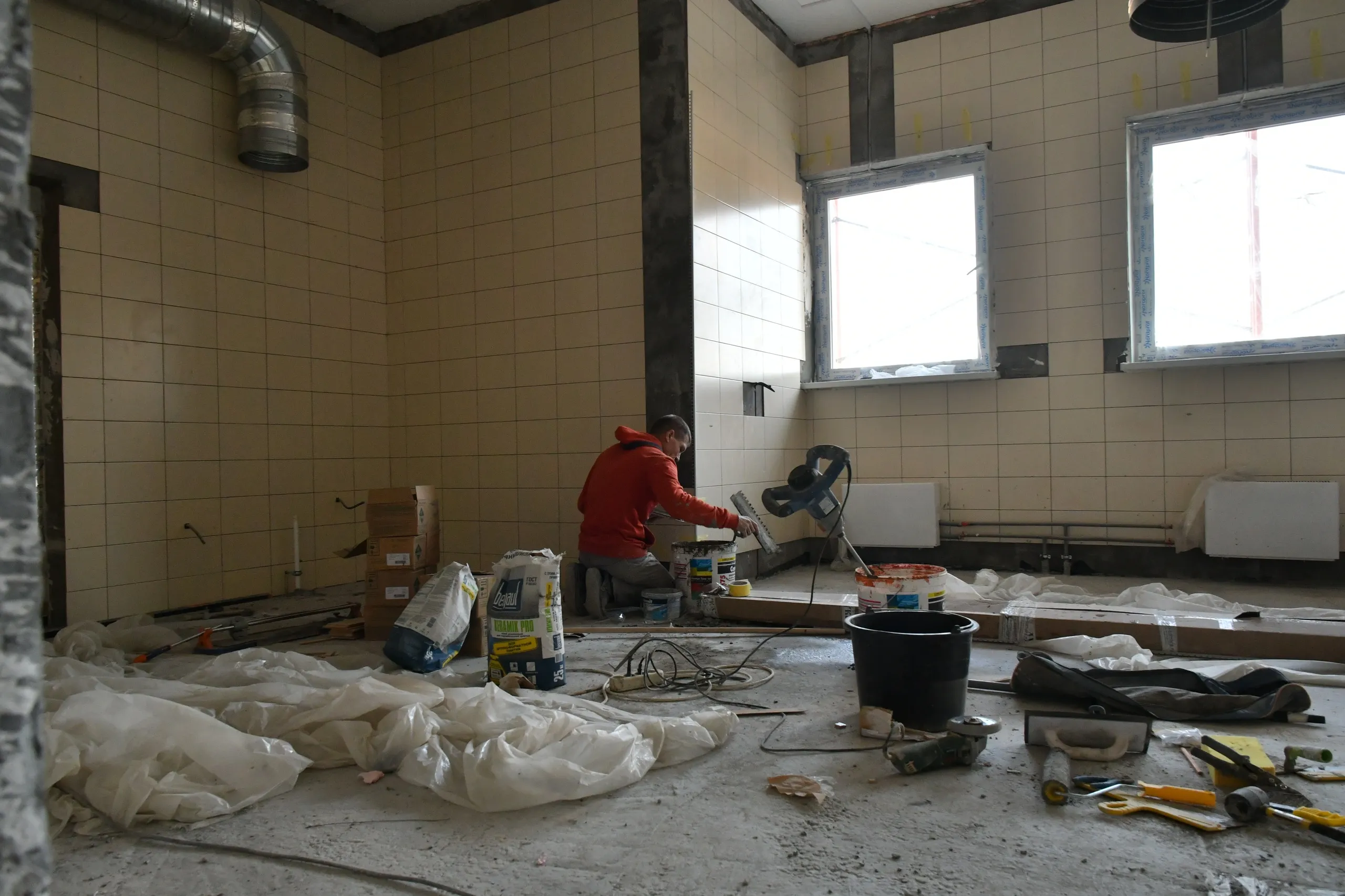 Внутренние инженерные системы готовы на 70 %, ведется обвязка радиаторов, устройство слаботочных систем. Устройство фасадов выполнено на 40 %. Практически готова кровля основного здания школы, спортзала, актового зала и столовой. Черновая отделка внутри помещений выполнена на 70 %, завершаются штукатурные работы, в столовой уже ведется монтаж плитки.