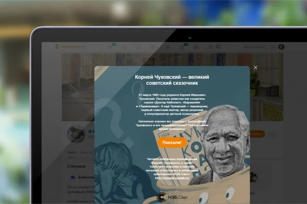 К его 140-летию в официальной группе библиотеки в ОК доступен тест из 10 вопросов: "Корней Чуковский - великий советский сказочник". Каждый вариант ответа, независимо от того, правильный или нет, содержит пояснения, благодаря которым можно не только проверить себя, но и узнать новые факты о жизни и творчестве писателя.