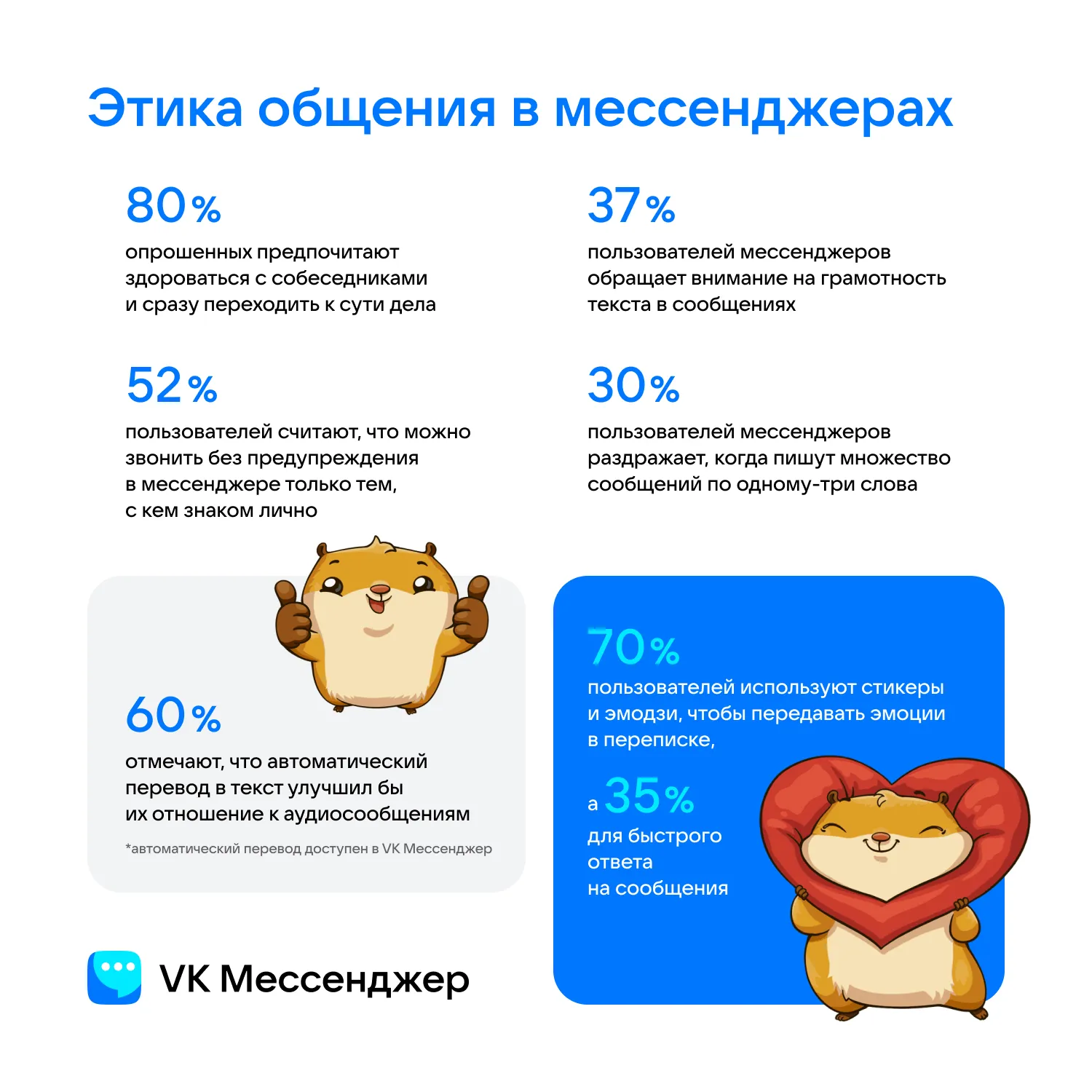 Как правило, с помощью стикеров и эмодзи люди выражают эмоции (70 %). 57 % они помогают придавать сообщениям дополнительный смысл. 35 % используют их для быстрого ответа.
