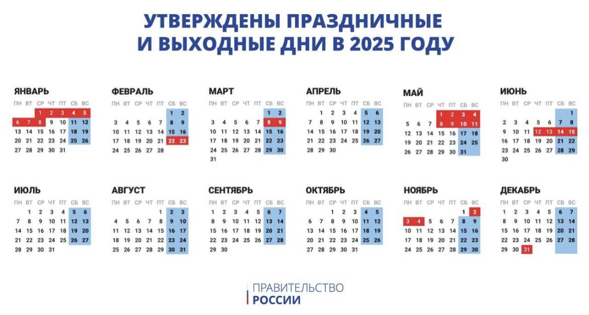Опубликован официальный календарь праздничных и выходных дней на 2025 год