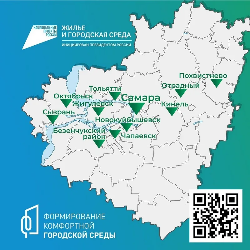 - В Новокуйбышевске сквер "Слава труду" (2 этап); территория в районе домов по пр. Победы, 48А и ул. Карбышева, 8А (2 этап); общественная территория вдоль ограждения биофабрики по ул. Карбышева и ул. Свердлова; территория в районе дома 14Б по ул. Карбышева (2 этап); общественная территория по ул. Свердлова, 1 и ул. Ворошилова, 2; территория по ул. Егорова (дублер) от дома 4 до пересечения с ул. Суворова; территория в районе ул. Киевская, 17-19; территория между ул. Егорова, 12-14 и детсадом "Гномик".