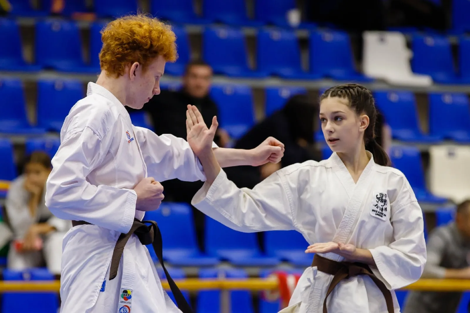 Например, ката бункай - яркое спортивное действо, пришедшее из Окинавы, где участники в паре не просто демонстрируют комплекс технических действий, но и разыгрывают интересные сцены на татами, проявляют артистизм. В двоеборье фокуго спортсмены работают в ката и в поединках.