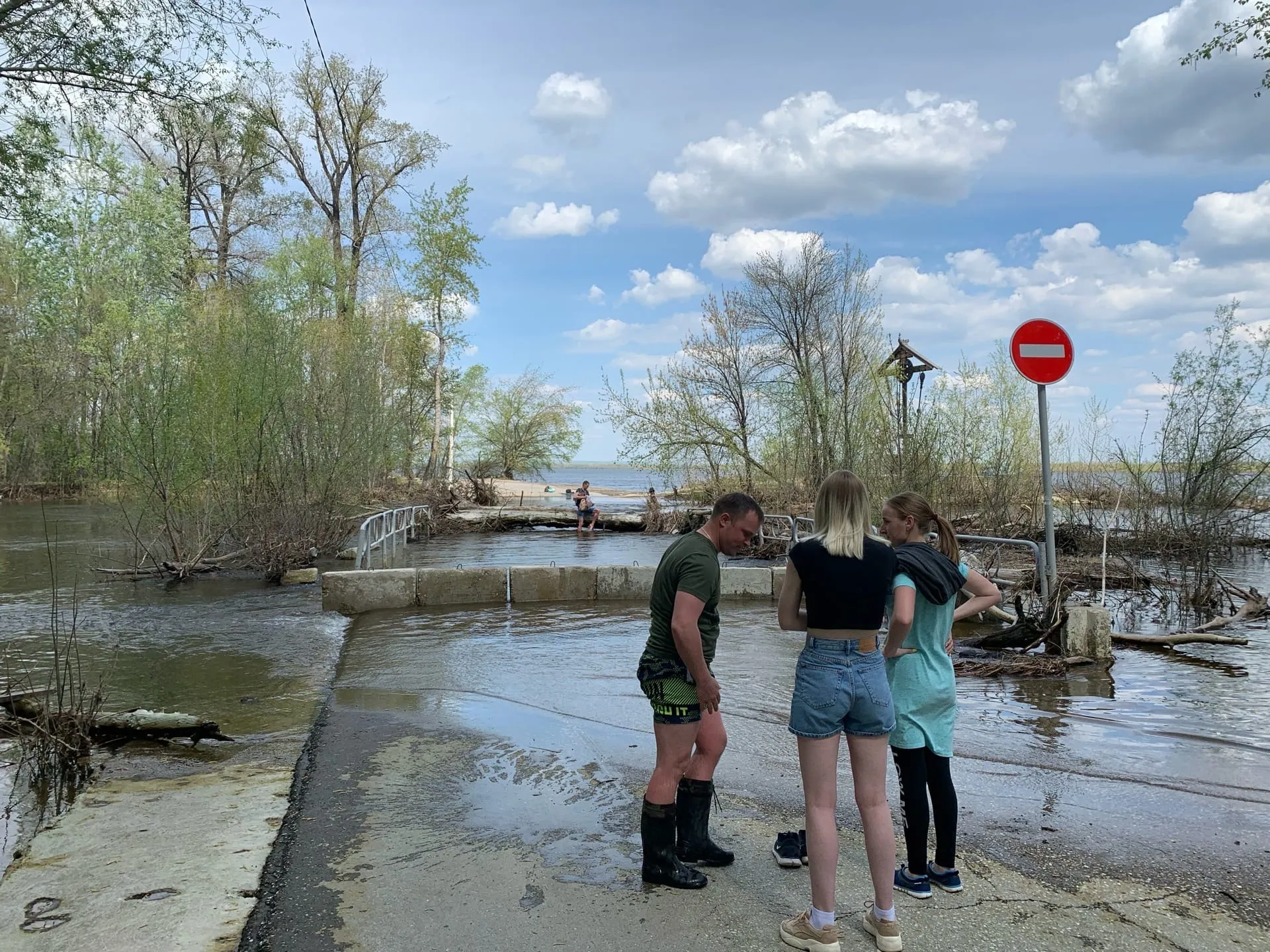 Небольшой мост в Гранном оказался затопленным. Но этот природный "сюрприз" вовсе не остановил компанию, которая решила отдохнуть на берегу Волги. Не долго думая, двое мужчин решили перейти достаточно мощный поток воды вброд. Сначала они на своих плечах переправили все вещи, а после принялись переносить своих спутниц.