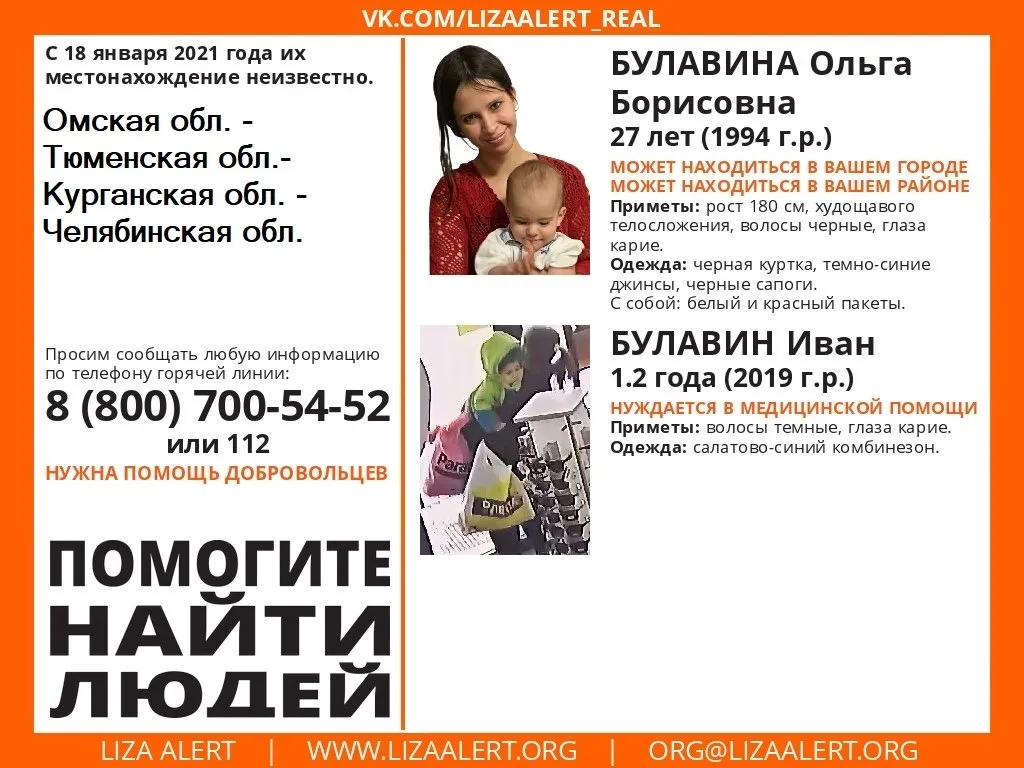 С 18 января в России разыскивают 27-летнюю Ольгу Б. и ее годовалого сына Ивана Б. Предположительно, они передвигаются автостопом по маршруту "Омск - Тюмень - Курган - Челябинск".