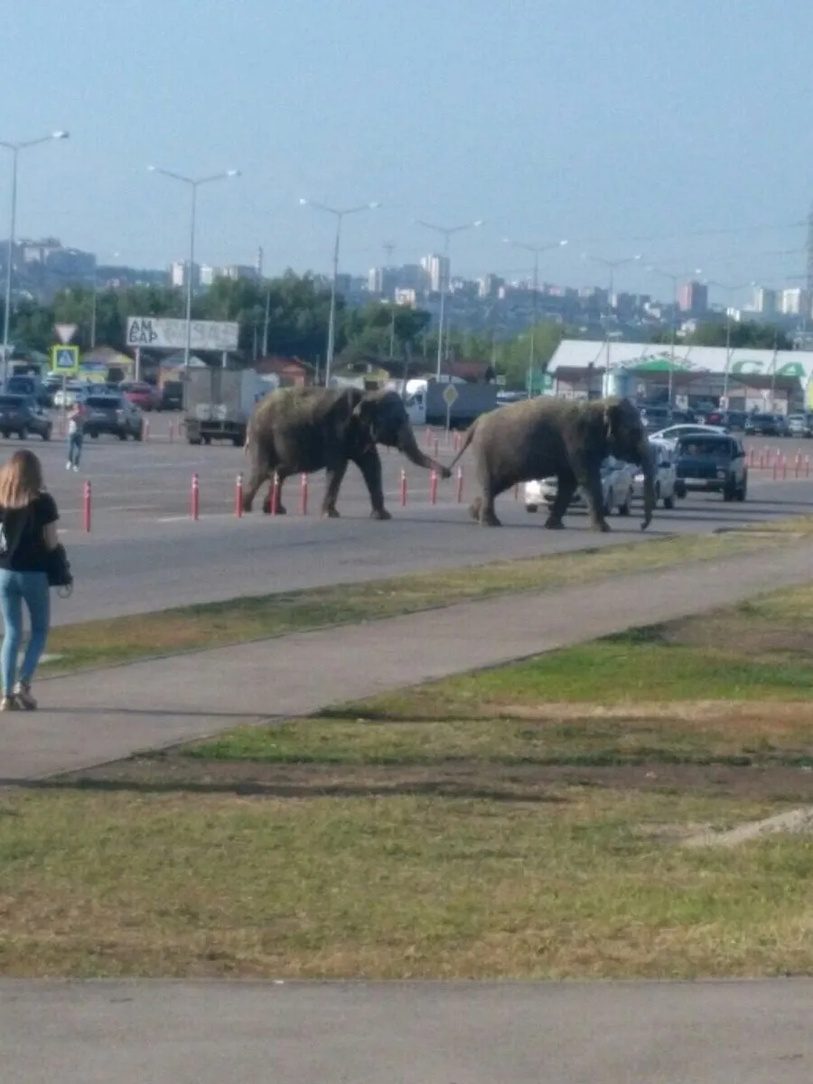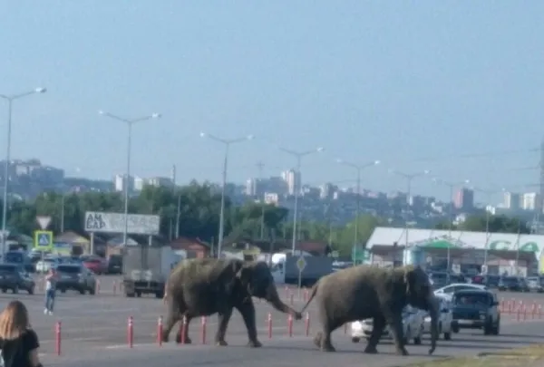 Самару посетили необычные гости. В город приехали слоны. Правда, до места выступления животные не доехали. Дрессировщики вывели животных погулять.
