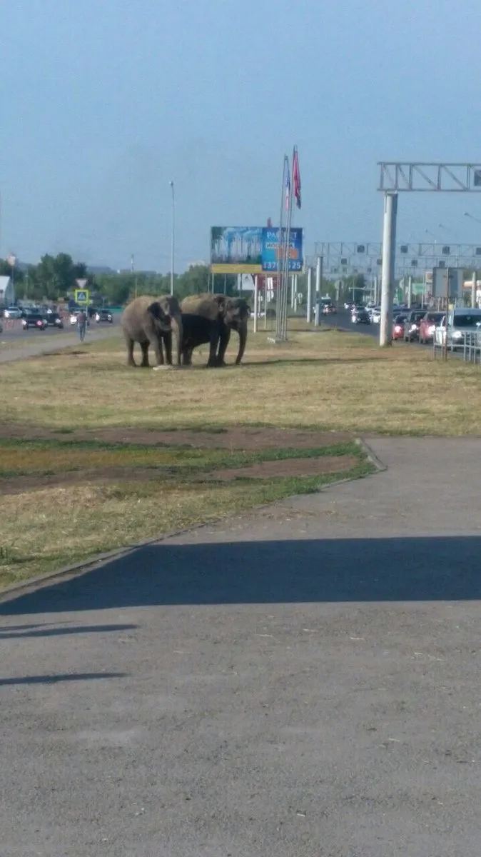 Парочку слонов увидели недалеко от торгового центра на Южном шоссе. Слоны дружелюбные и прогуливаются, держась друг за друга. Один схватился за второго хоботом за хвост.