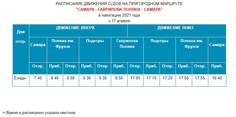 По маршруту Самара - Гаврилова Поляна - Самара суда будут ходить каждый день с 7:45 до 18:40. По пути туда и обратно теплоход должен останавливаться на Поляне им. Фрунзе и в Подгорах. Пока будет выполняться один рейс в день.