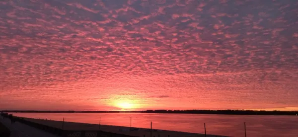 - Сегодня был необычный закат в Самаре: облака нижнего яруса, которые покрывали по сути весь небосвод, развалились на отдельные "хлопья", а багряные лучи солнечного октябрьского заката прожигали насквозь эти "хлопья", и весь небосвод походил на гигантскую шкуру леопарда, вывернутую наизнанку, которая охватывала этот небосвод, пытаясь согреть его огненно-алыми, но все же холодными лучами.