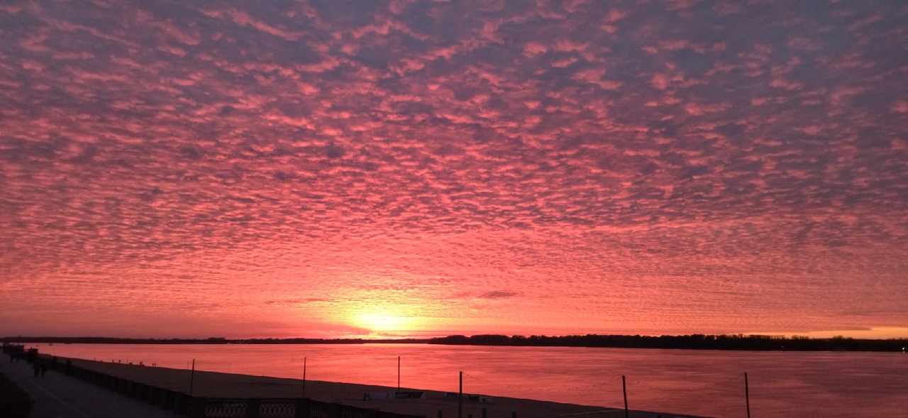 - Сегодня был необычный закат в Самаре: облака нижнего яруса, которые покрывали по сути весь небосвод, развалились на отдельные "хлопья", а багряные лучи солнечного октябрьского заката прожигали насквозь эти "хлопья", и весь небосвод походил на гигантскую шкуру леопарда, вывернутую наизнанку, которая охватывала этот небосвод, пытаясь согреть его огненно-алыми, но все же холодными лучами.