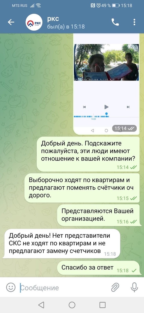 Самарец заметил, что успел сфотографировать лжересурсников и отправить их фото в чат с "РКС-Самара". Ответ организации только подтвердил его подозрения: