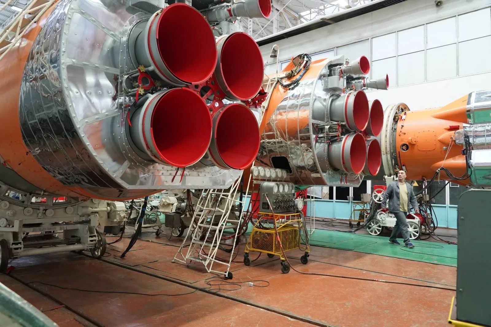 Для журналистов провели экскурсию по цеху окончательной сборки ракет-носителей, в котором кипит работа. В марте этой сборочной площадке исполняется 65 лет, в свое время ее посещали Сергей Королев и Юрий Гагарин. Когда-то здесь собирали самые первые ракеты Р-7, а сейчас выпускают новое поколение ракет "Союз-2" различных модификаций.