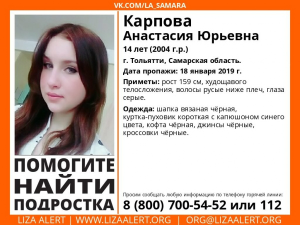 Сегодня, 25 января, добровольческий поисково-спасательный отряд "Лиза Алерт" сообщил о пропавшей в регионе девочке. 14-летнюю Анастасию К. из Тольятти разыскивают уже неделю. Она не выходит на связь с родными с пятницы, 18 января
