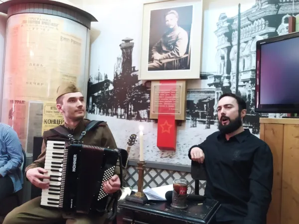 После концерта научный сотрудник музея Дмитрий Березкин провел экскурсию для гостей. Один из залов посвящен формированию двух основных "лагерей" Гражданской войны - Красного и Белого. Здесь, например, можно увидеть формы красногвардейца и корниловца, фотографии организаторов "белого сопротивления".