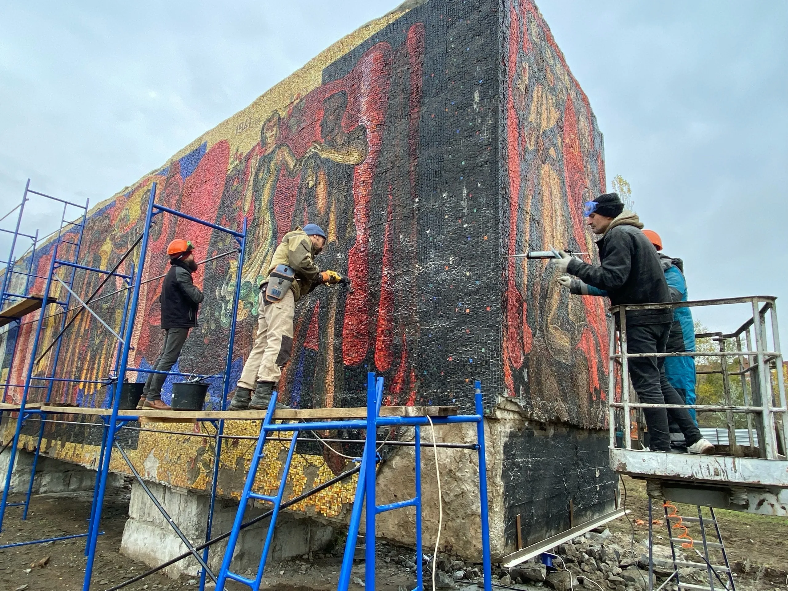Также реконструкторы продумали, как защитить панно от вандалов. Строители создали на всем периметре стелы выравнивающую планку, которая будет фиксировать нижнюю линию окончания мозаичного набора. Сейчас возобновляются также работы по созданию сети химических анкеров, которыми усиливают штукатурную основу.