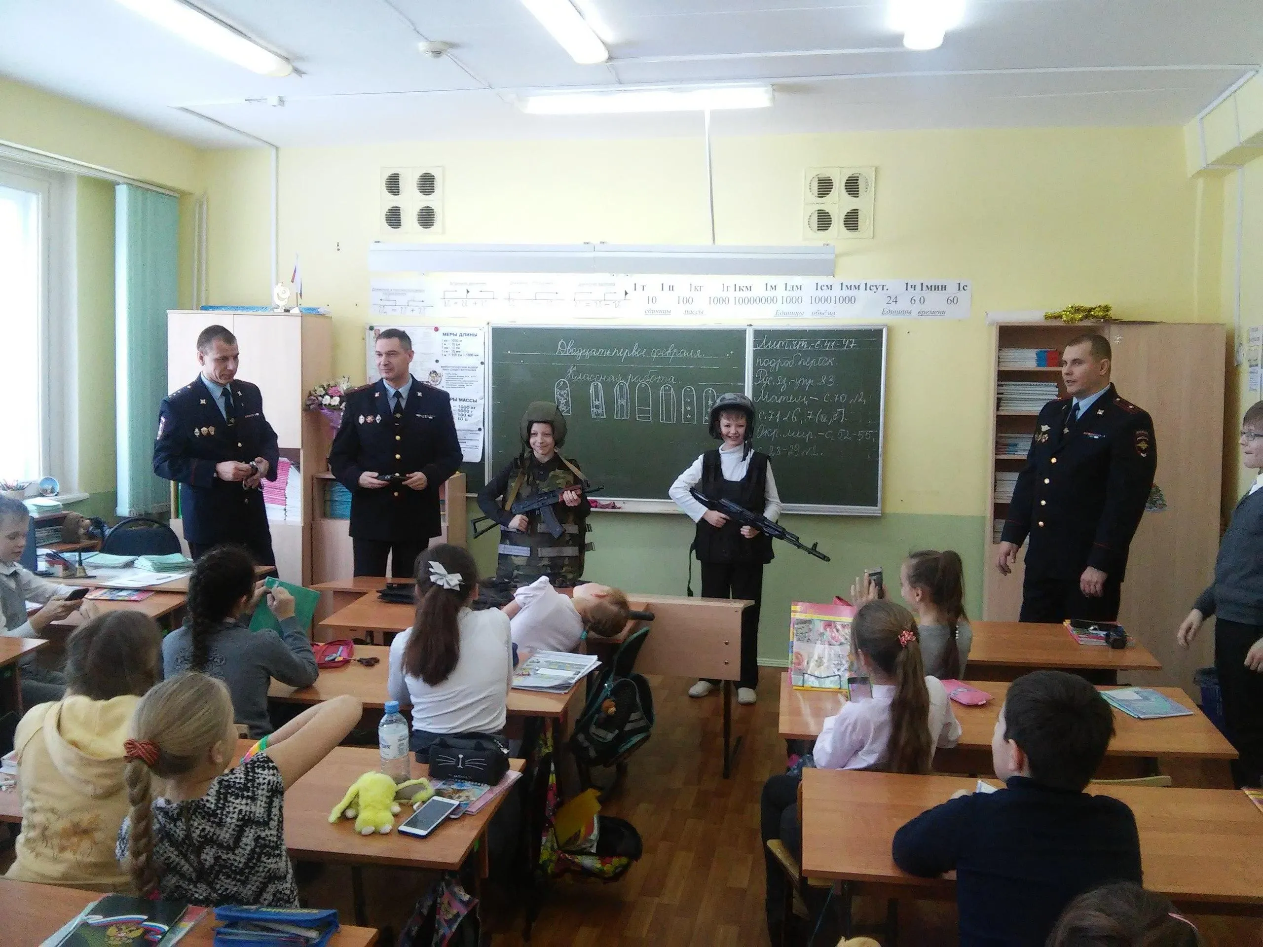 Одним из самых запоминающихся моментов этого урока мужества для ребят стала возможность подержать в руках и даже примерить образцы индивидуальной бронезащиты и оружия, стоящие на вооружении вневедомственной охраны.