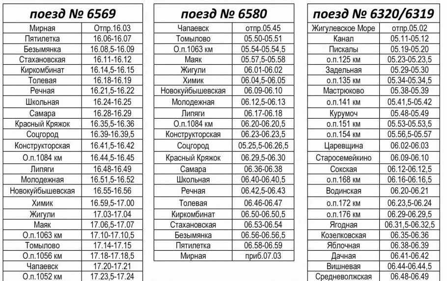 Электричка № 6325 будет отправляться из Курумоча в 9:14 и прибывать на станцию Жигулевское Море в 10:02. Поезд № 6569 будет следовать от Мирной в 16:03, прибывать в Самару в 16:28 и на станцию Сызрань-1 в 18:58. Поезд № 6320/6319 теперь будет отправляться от Жигулевского Моря в 5:02 и прибывать в Самару в 7:20. Поезд № 6580 будет следовать из Чапаевска в 5:45, прибывать в Самару в 6:36 и на станцию Мирная в 7:03. Стоит учитывать, что в расписании движения указано московское время.