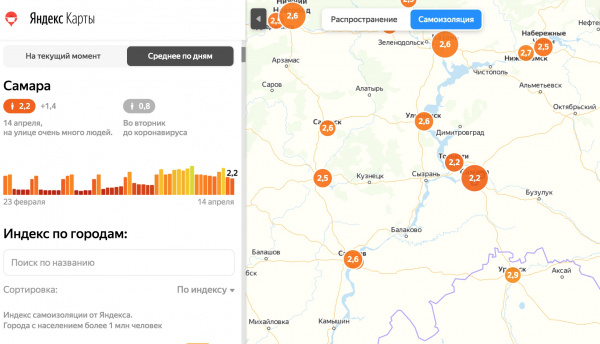 По данным Яндекса на полдень 15 апреля, индекс самоизоляции в Самаре составил 1,9 баллов. Это означает, что на улице очень много людей. Это самый низкий результат за весь период наблюдений. Самый высокий индекс самоизоляции горожан был зафиксирован 5 апреля и составил 3,9 баллов.