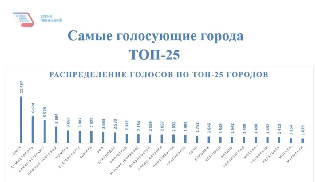 Так, из 12 имен, набравших на втором этапе общенациональной акции необходимое количество голосов для добавления в лонг-лист, два предложены нашими земляками, сообщает департамент информационной политики администрации губернатора. В итоге Самара признана одним из самых голосующих городов, опередив Москву и большинство других участников. В числе прочих позади остались Уфа, Владивосток, Новосибирск, Сочи и Казань. Обойти наш регион удалось лишь Омску, Симферополю, Санкт-Петербургу, Нижнему Новгороду, Тюмени и Екатеринбургу.
