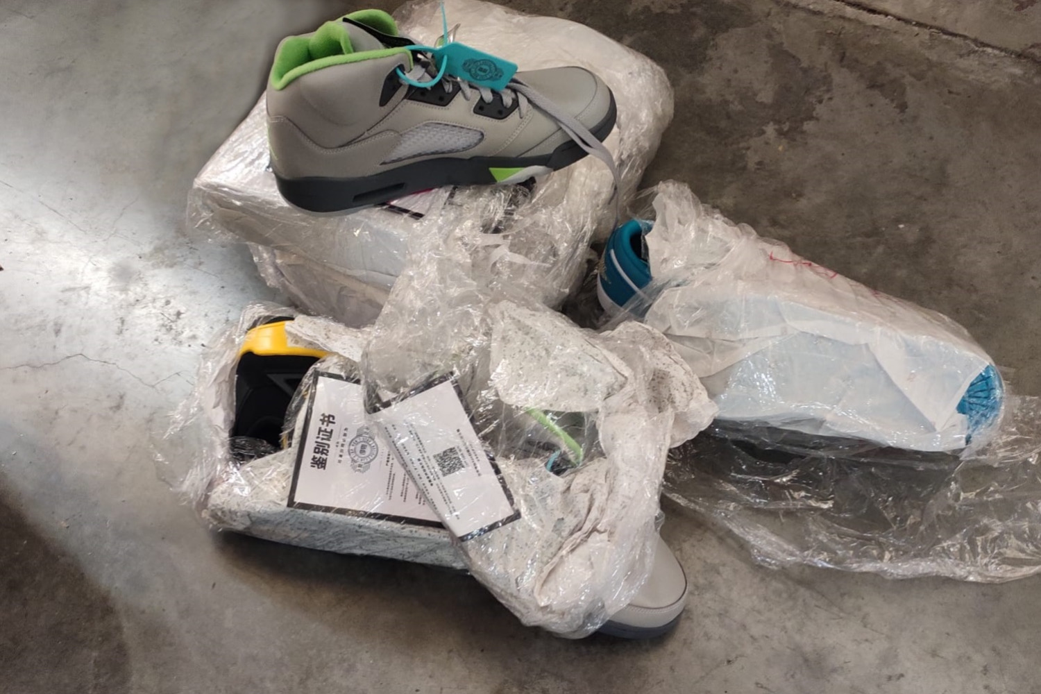 В грузовиках инспекторы обнаружили почти 20 тонн товаров без маркировки: 20 тысяч курток, две тысячи пар обуви и носки с логотипами известной фирмы, но без подтверждающих документов.