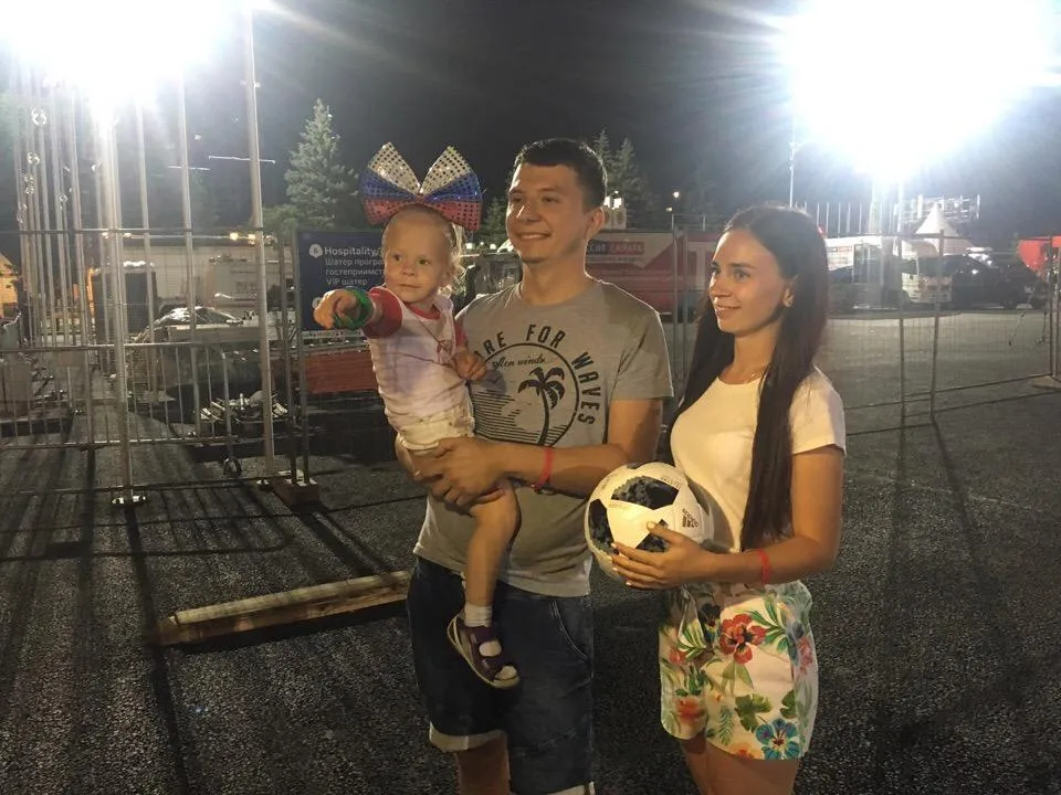 Перед началом игры нашей сборной на сцену самарской фан-зоны вызвали 500-тысячного посетителя. Им оказался Ярослав Есаулов, пришедший сюда с женой Ксенией и дочкой Ариной. По его словам, они хотели показать малышке небывалую атмосферу фан-феста. Несмотря на свой юный возраст девочка разделяет увлечение родителей и даже немного занимается футболом. Семейная пара была на матчах на "Самара Арене", а вот на фан-зону попала впервые. И сразу - в числе счастливчиков. Впрочем, как считают родители, удачу им принесла именно Арина. За матчем Россия - Хорватия семья смотрела с VIP-трибун, билеты на которые получила в подарок от организаторов фан-феста.