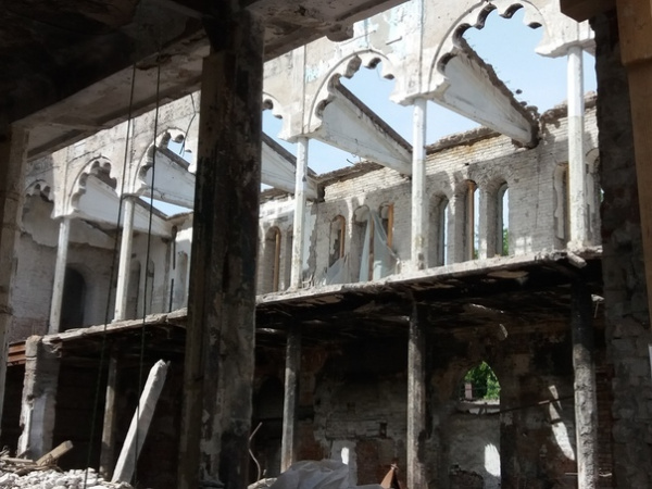 В настоящее время завершены работы по демонтажу поврежденной кирпичной кладки части простенков восточного и южного фасадов и поздних конструкций крыши, демонтирована часть железобетонных колонн и перекрытий советского периода и проводится вычинка наружной версты кирпичной кладки в уровне первого этажа на северном и южном фасадах.