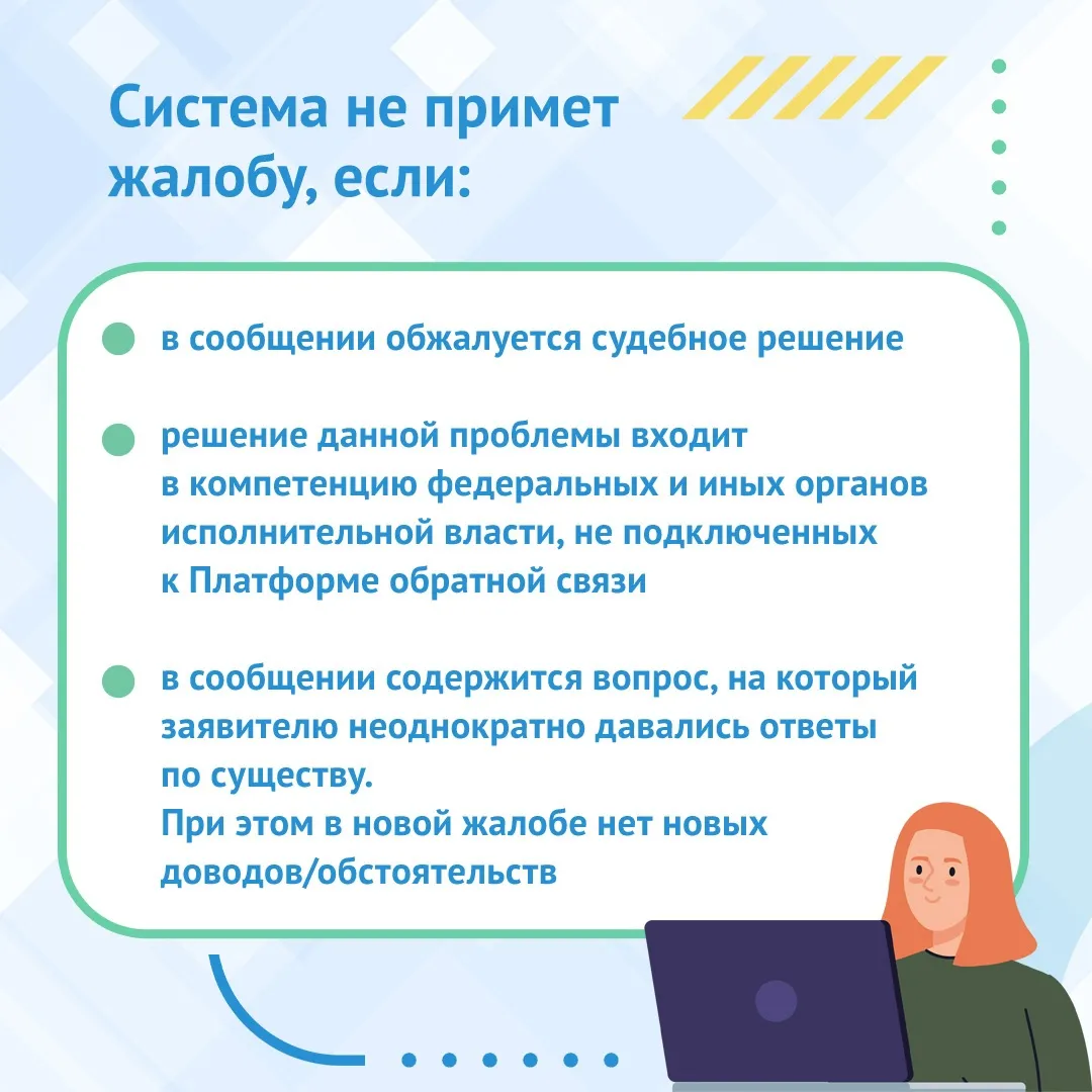 Также нельзя обжаловать судебные решения, обращаться с проблемой, которая не входит в компетенцию федеральных и иных органов, не подключенных к платформе. Не ответят и в случае повтора вопроса без новых доводов.