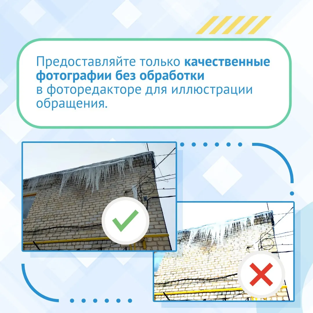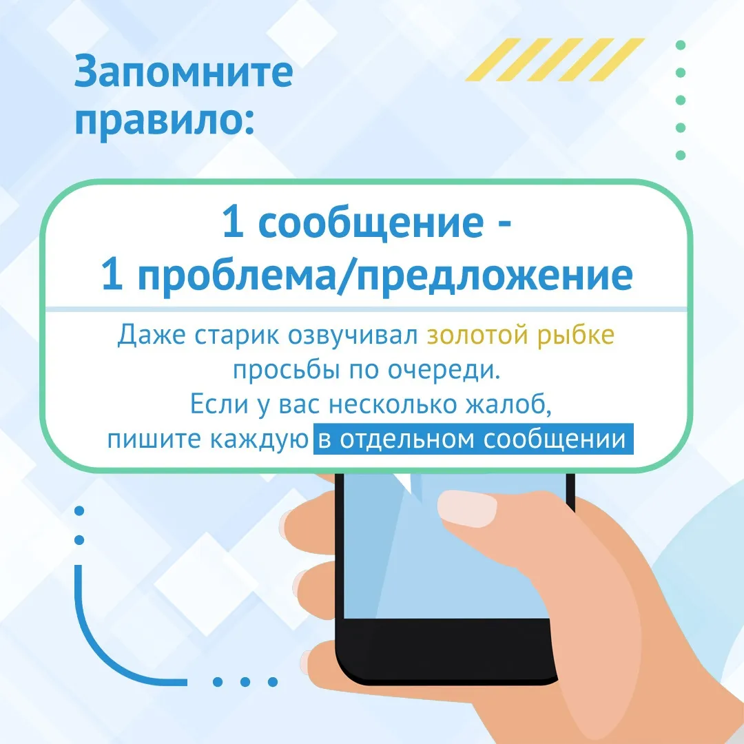 Чтобы система приняла вашу жалобу, она должна быть корректно подана. Главное правило портала – 1 сообщение должно содержать только 1 проблему или предложение. Если у вас накопилось несколько вопросов, то каждый из них лучше подать отдельным обращением. Также предоставлять фотографии нужно только в хорошем качестве, без обработки в фоторедакторе.