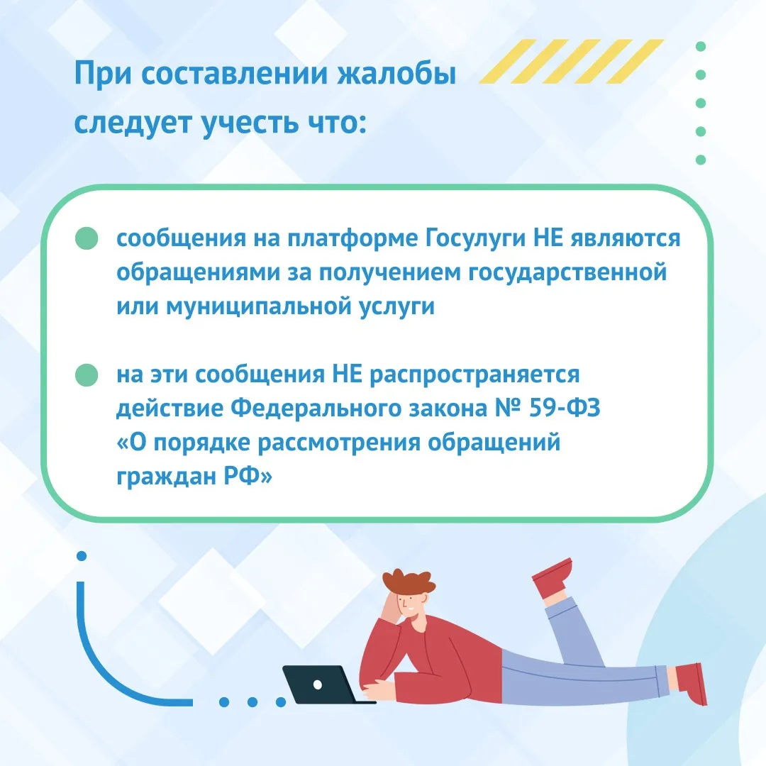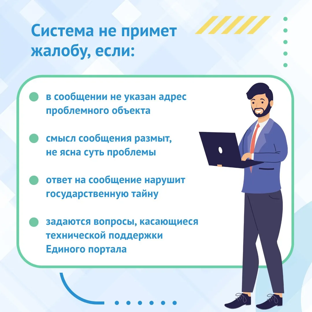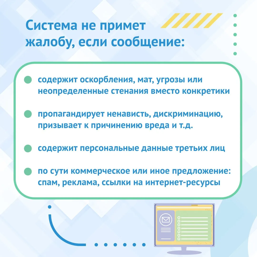 Кроме того, система не примет жалобу, если она содержит оскорбления, мат, угрозы или неопределенность. Сообщение отклонят, если оно пропагандирует ненависть, дискриминацию или призывает к привлечению вреда. Также не стоит указывать личные данные третьих лиц и отправлять рекламные сообщения, спам и ссылки на интернет-ресурсы.