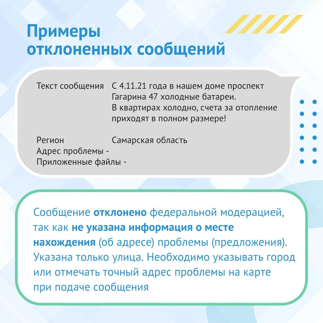 Стоит отметить, что сроки решения проблемы во многом зависят от формулировки. Большая часть некорректных сообщений отклоняются федеральным модератором и просто не доходят до Самарской области.