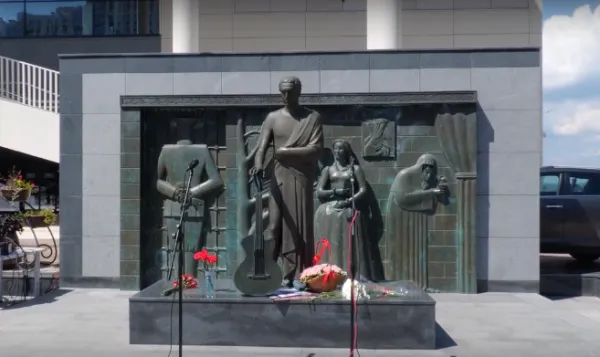 Здесь есть и мифическая птица "Алконос" из песни "Купола", и Марина Влади со своей книгой "Владимир или Прерванный полет", и фигура Смерти, прикрывающая лицо театральной маской. У Дворца спорта памятник Высоцкому установлен не случайно - именно в этом месте поэт дал масштабный концерт для шести тысяч зрителей.