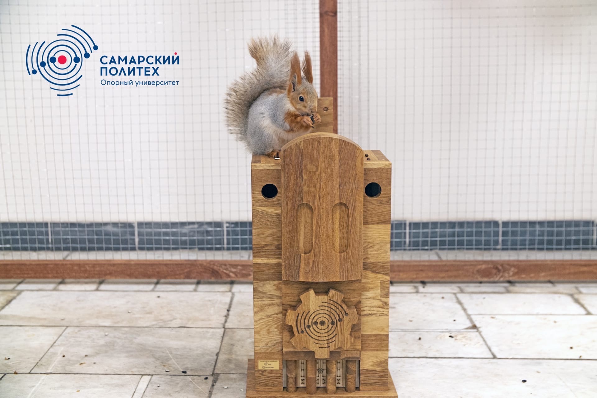После появился домик для грызунов в форме главного корпуса СамГТУ. Для его изготовления использовали настоящий дуб. Он получился не только экологичным, но тёплым и просторным. О безопасности проектировщики тоже подумали. Внутреннее пространство домика разделено пополам горизонтальной консолью, чтобы пушистый гость в случае опасности мог спрятаться на первом этаже.
