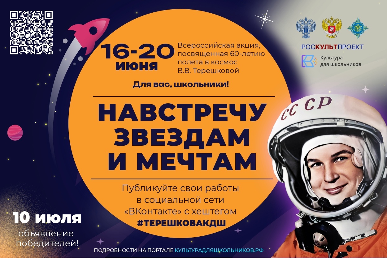 Для участия в интерактивной части акции школьникам необходимо создать собственный видеоролик на тему "Первая женщина-космонавт", сделать пост, опубликовать его в период с 16 по 20 июня включительно на своей странице (или родителя, педагога, учреждения) в социальной сети ВКонтакте с хештегом #Терешковакдш, указав регион, имя/фамилию, название коллектива или учреждения.