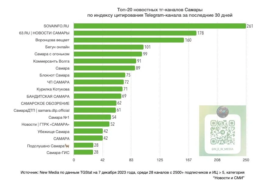 В топ вошли новостные телеграм-каналы губернии, у которых более 2,5 тысяч подписчиков. Sovainfo.ru возглавил рейтинг с индексом цитируемости 261. Он рассчитывается на основе упоминаний в других каналах в социальной сети. Ведущие позиции рейтингов разных аналитических компаний занимают все ресурсы Самарского областного вещательного агентства. За третий квартал 2023 года сайт Sovainfo.ru (16+) закрепился на второй позиции в рейтинге самых цитируемых СМИ региона.