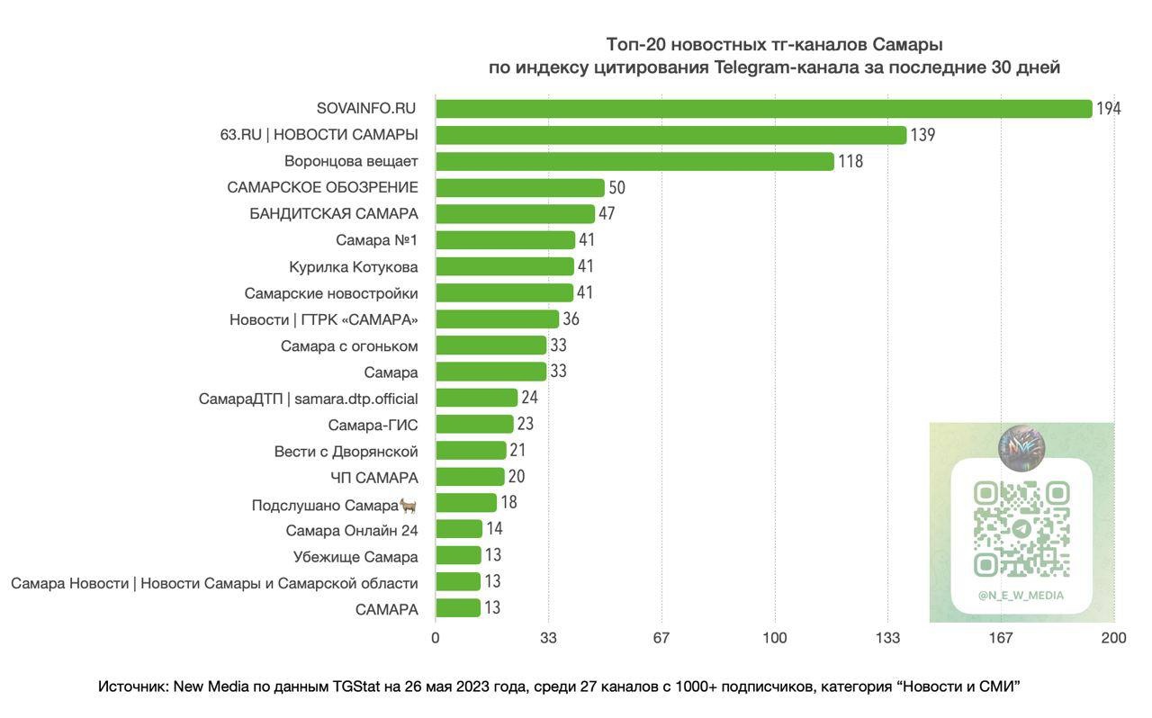 Рейтинг составлен за последние 30 дней среди каналов с более 1000 подписчиков в категории "Новости и СМИ". Показатель цитирования рассчитывается на основе упоминаний в других каналах в Телеграме. Рейтинг составлен на основе исследования 27 телеграм-каналов на 26 мая 2023 года. Отметим, что в апреле телеграмм-канал "СОВЫ" вошел в топ-5 лучших региональных СМИ по цитируемости.