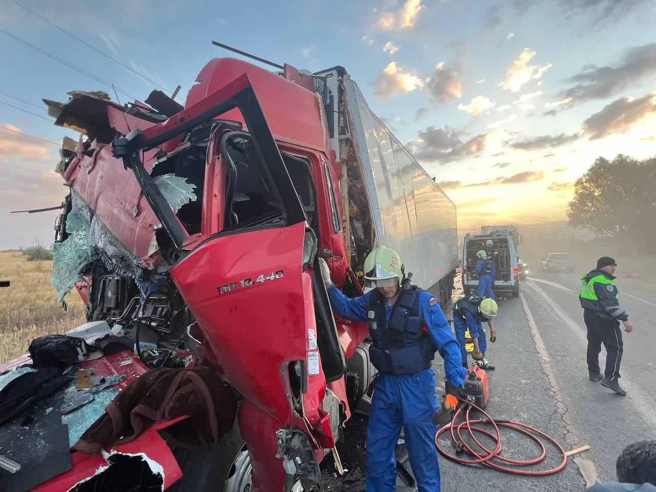 На место происшествия прибыли специалисты поисково-спасательного отряда. Они помогли выбраться водителю первой фуры, который оказался заблокирован в кабине. Для этого пришлось отжать дверь и приборную панель, а также срезать крышу. В операции участвовали 4 специалиста.