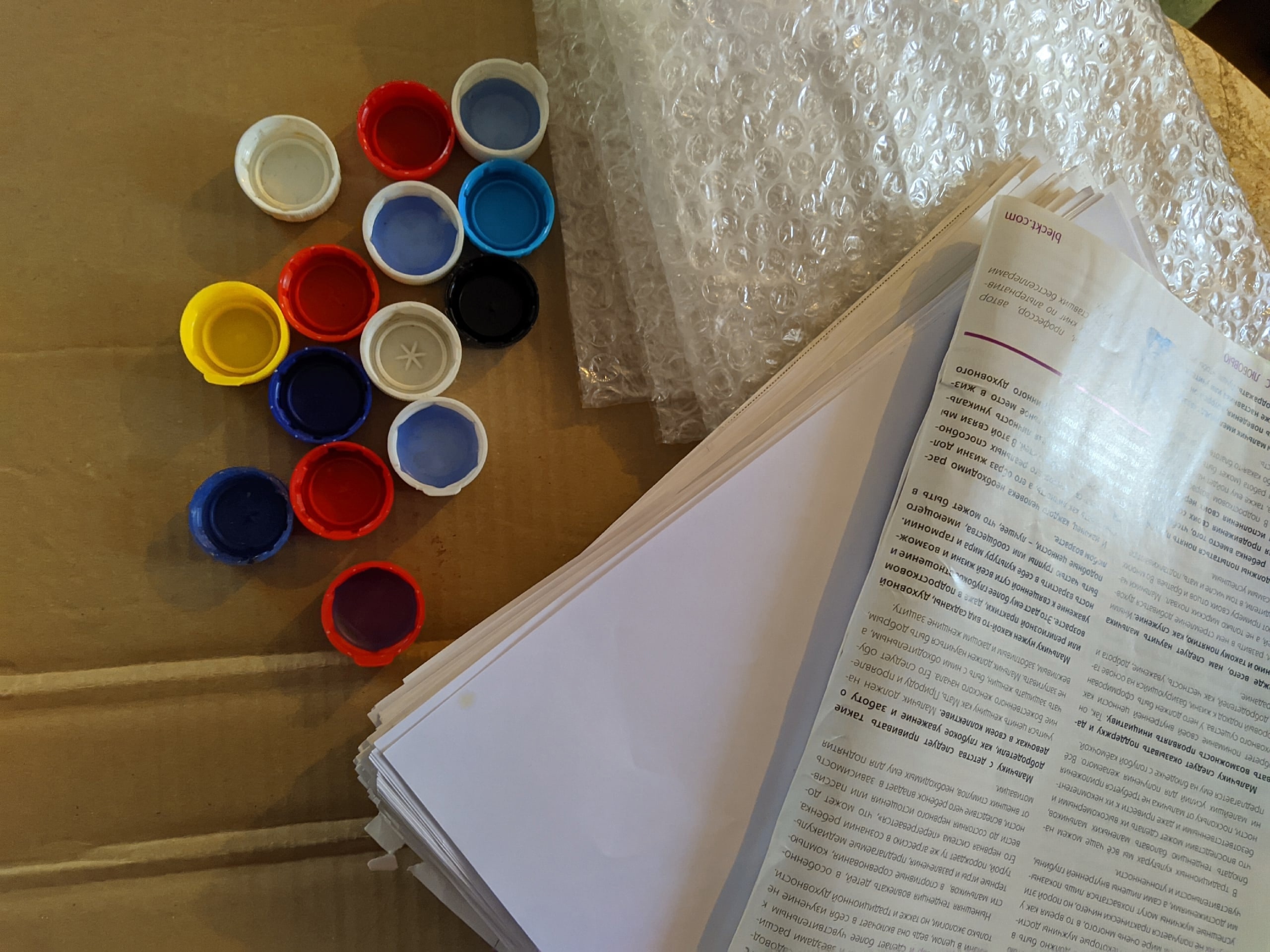 В списке принимаемого вторсырья - бумажные отходы. Например, гофрокартон (без скотча и ламинации в виде плоских листов и разложенных коробок); тонкий картон от тетрадных обложек, коробок от чая и тому подобного. Принимают испечатанную и исписанную офисную бумагу (А4 и А3), листовки, буклеты, тетради. Листы, изрисованные гуашью, со следами пластилина, полимеров, а также с металлическими включениями не подходят в качестве вторсырья. Принимают газеты (стопками, а не смятые в комки), а также журналы и книги со снятыми твердыми и глянцевыми обложками.