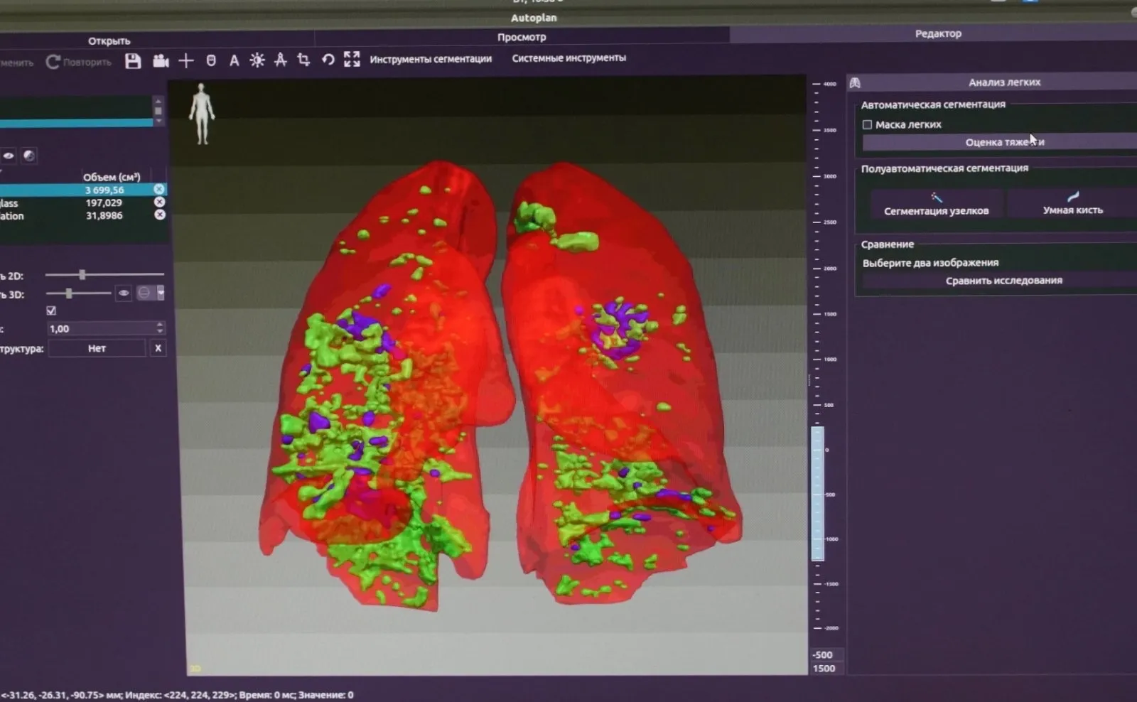 - В прошлом году компьютерная томография, в частности легких, стала очень популярной, количество исследований возросло в разы, так же как и нагрузка на врачей, - рассказывает заведующий рентгеновским отделением Клиник СамГМУ Павел Зельтер. - Мы начали искать способы снижения этой нагрузки и уменьшения времени, затрачиваемого на анализ одного исследования. И в этом нам помог искусственный интеллект. Мы обратились в институт инновационного развития нашего университета, где специалисты разработали систему, которая помогает врачам с подсчетом доли поражения легочной ткани коронавирусом. Это позволяет составить более объективную картину по каждому пациенту.