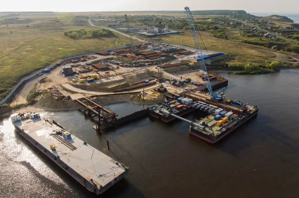 Кроме того, полностью подготовлены производственные площадки для строительных материалов. Выполнены работы по устройству опалубки, армированию ростверка и бетонированию, идет погружение свай. После отсыпки полуостровков строители приступят к сооружению шести опор. Больше чем наполовину сварили контрольный образец пролетного строения.