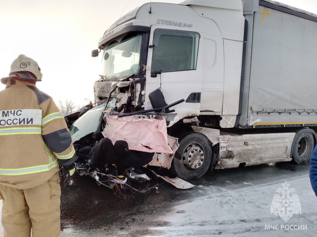 По данным ГУ МЧС Оренбургской области, авария произошла 5 января в 11:18 на 380-м километре трассы М5 "Урал" в Переволоцком районе. Там столкнулись грузовик Scania и легковой автомобиль, который от удара превратился в груду металла.