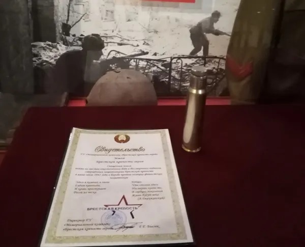 На свидетельстве, которое подтверждает, что эта священная земля взята на местах ожесточенных боев и бессмертных подвигов, совершенных защитниками Брестской крепости в июне-июле 1941 года в борьбе против немецко-фашистских захватчиков, и подписано директором ГУ "Мемориальный комплекс "Брестская крепость-герой", написано стихотворение: