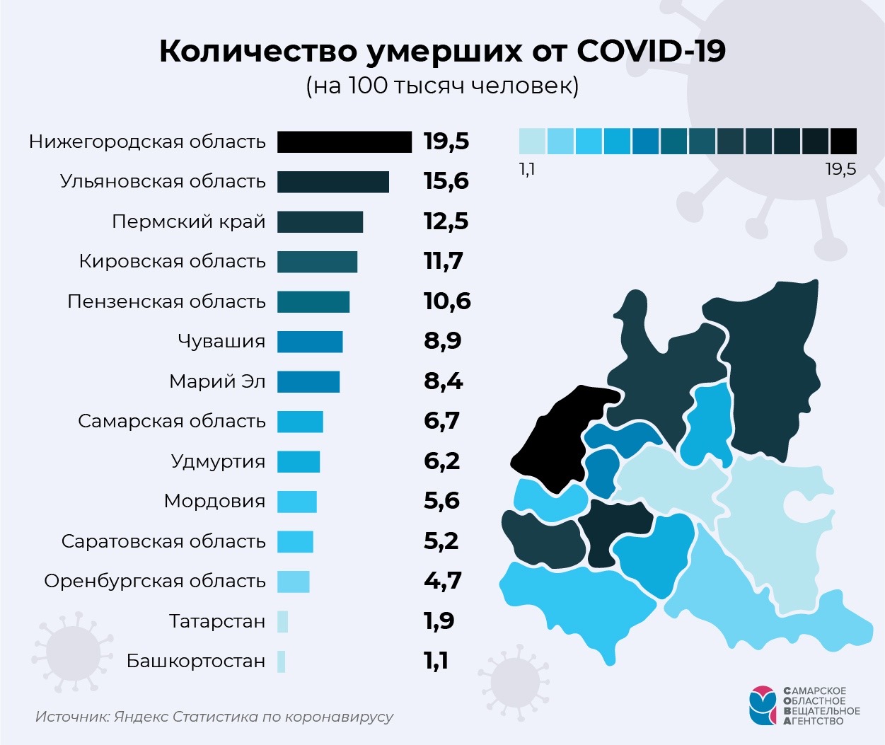 Количество умерших от коронавирусной инфекции (на 100 тысяч человек) в Самарской области - 6,7. По этому показателю - тоже вторая половина списка