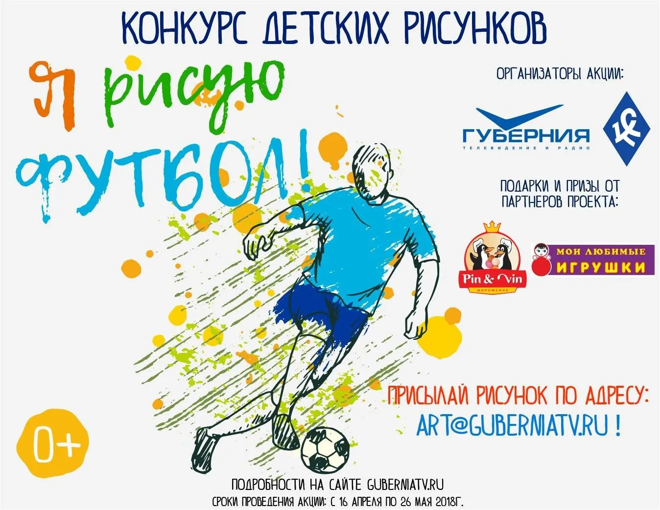 Телерадиокомпания "ГУБЕРНИЯ" совместно с "Крыльями Советов" запускают конкурс детских рисунков, приуроченный к чемпионату мира по футболу FIFA-2018 в России. К участию допускаются юные художники от 5 до 17 лет, чьи рисунки будут соответствовать следующим темам: "Чемпионат мира по футболу в Самаре", "Я играю в футбол", "Футбол объединяет".