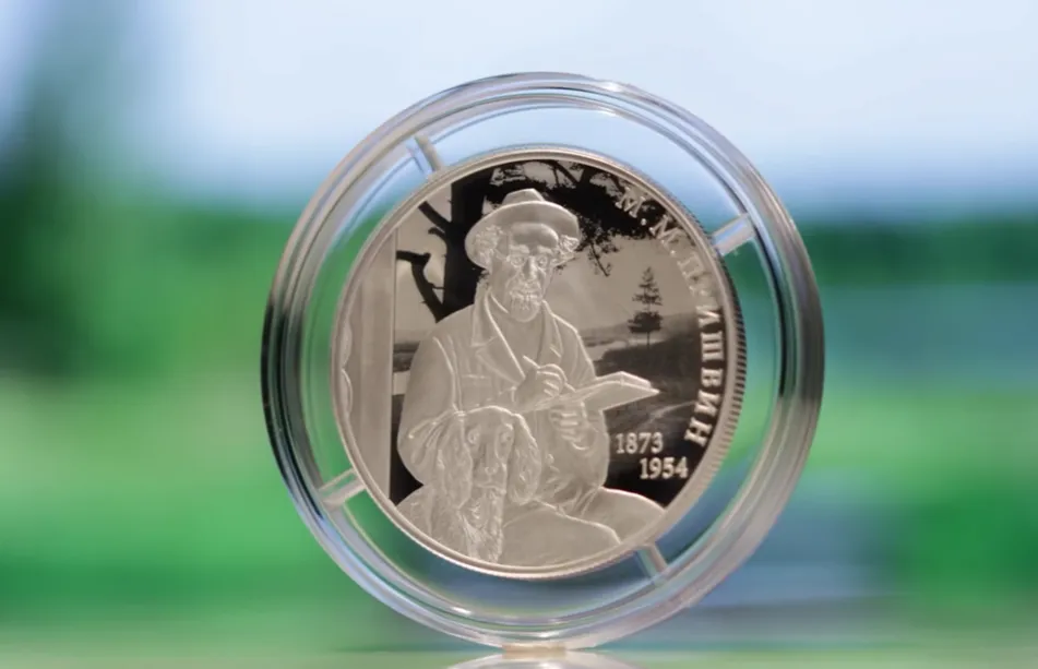 Монета в честь Михаила Пришвина - автора многочисленных рассказов и очерков о родной природе - выпущена 23 января к 150-летию со дня его рождения тиражом в три тысячи штук.
