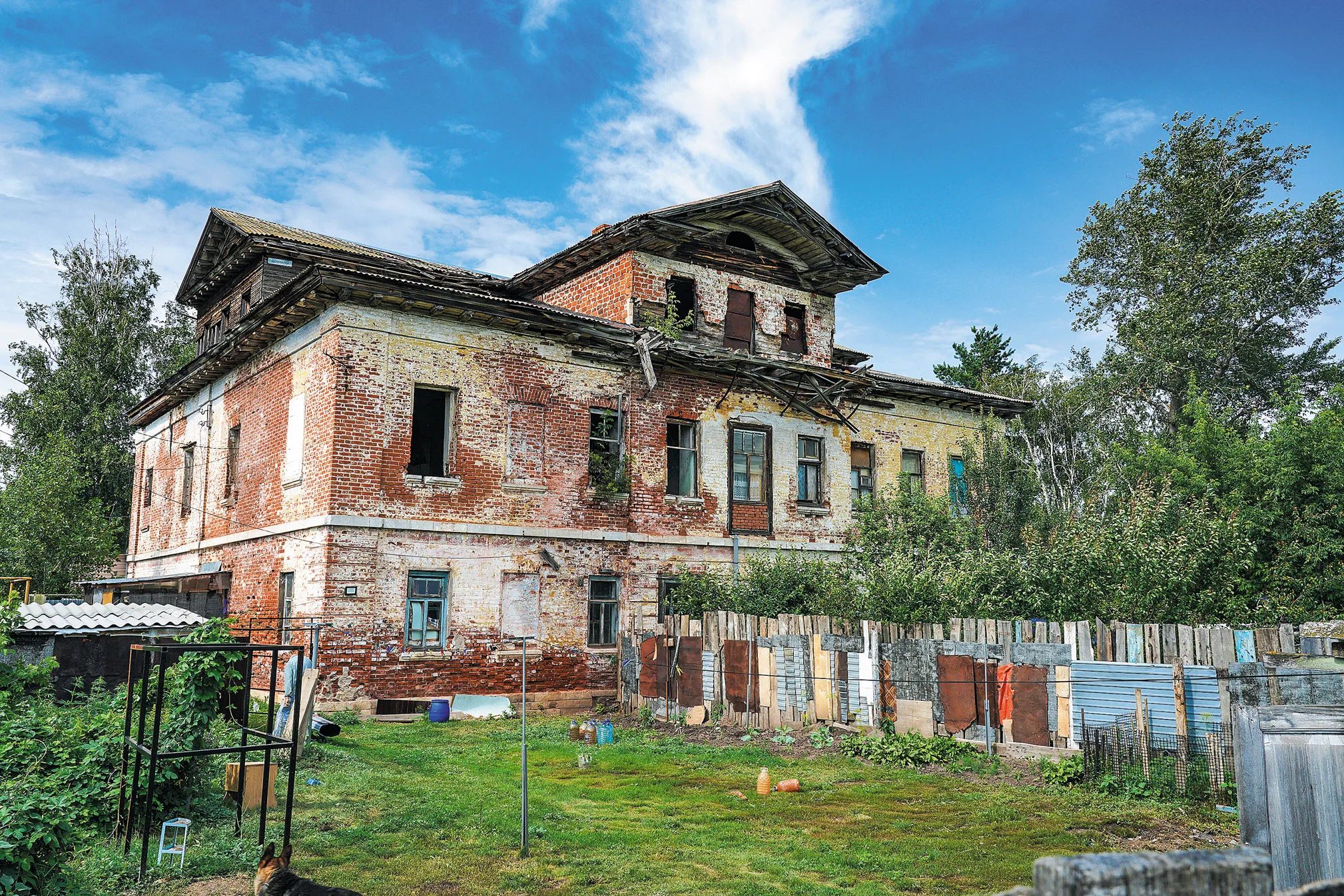 Следующая остановка - у водонапорной башни 1907 года. Ее возвели над артезианской скважиной. Сейчас объект находится на реставрации. Раньше внутри был установлен насос, который обеспечивал водой все село. Постройку и другие элементы комплекса от дороги отделяет забор. Пока неизвестно, как приспособят эту территорию. Рядом располагается сельскохозяйственный техникум - кирпичное двухэтажное здание, построенное до революции.