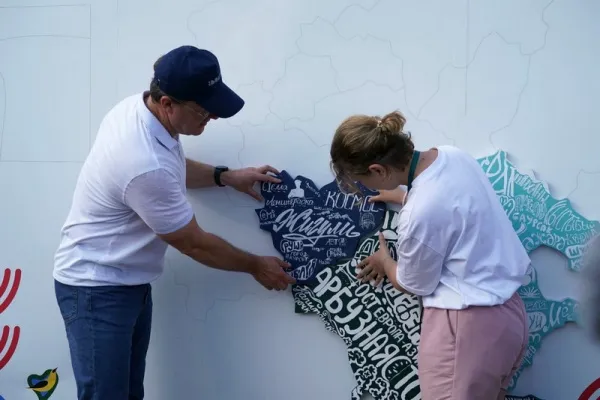 Вместе с Игорем Комаровым и Дмитрием Азаровым, а также врио губернатора Саратовской области Романом Бусаргиным и врио главы Марий Эл Юрием Зайцевым участники форума установили последние фрагменты карты на общую основу.