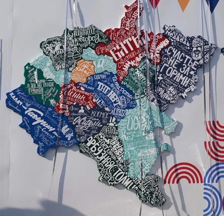 Сегодня же на форуме прошла торжественная церемония сборки карты ПФО. Напомним, что в начале форума каждой региональной делегации были розданы части большой (3 на 3 метра) деревянной карты Приволжского федерального округа. В течение нескольких дней творческие группы от каждого из 14 регионов ПФО изучали искусство каллиграфии и леттеринга и расписывали карты своих регионов в разных техниках.