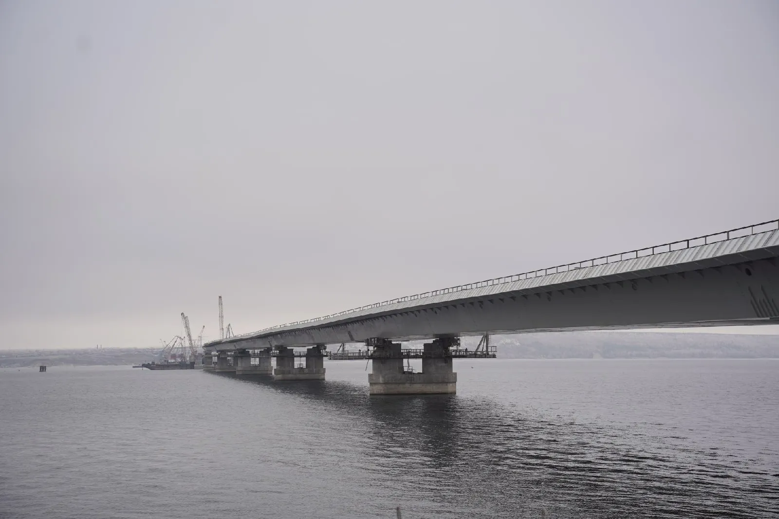 - У нас всего 26 опор, 25 пролетных строений. Работы идут на всех 26 опорах, 15 построены. Выполнены надвижки 7 пролетных строений на левом берегу и 4 - на правом. С 10-12 декабря мы выходим на последние ключевые опоры. Самая главная - 13-я опора, на которой мы стыкуемся: опора принимает два пролета с двух сторон. Ее надвижка запланирована на середину января, - рассказал Дмитрий Кондаков, - Мы уже начали делать монтаж всех металлоконструкций на окрашенных пролетах как с левой стороны, так и с правой стороны. В зиму предполагаем планово это делать. Предстоит выполнить большой комплекс работ по прокладке кабельных мостов, электрики, служебных проходов. Людей для выполнения работ хватает.