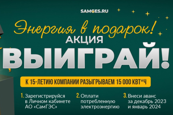 Сроки проведения акции с 25.10. по 25.12.2023 г. Розыгрыш призов состоится 12 января 2024 года среди всех участников, выполнивших условия. Информацию об организаторе акции, о правилах ее проведения, количестве предложений, сроках, месте и порядке их получения можно узнать на официальном сайте АО "СамГЭС" samges.ru.
