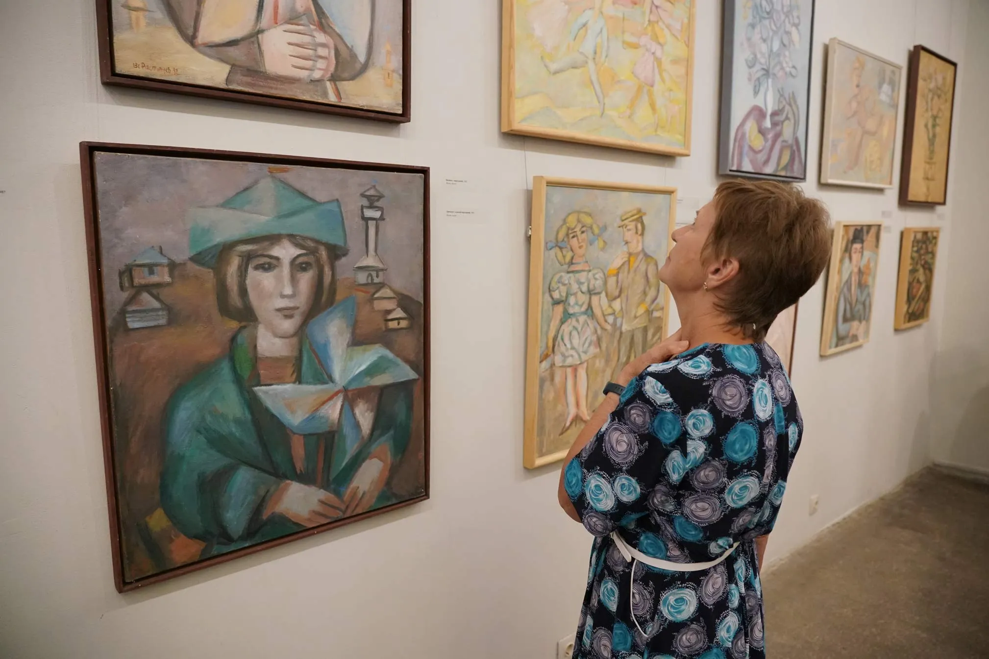 В экспозиции представлены две серии работ. Живописные "Городецкие фантазии" наивны, полны иронии и любви к жизни. На картинах изображены франтихи в немыслимых шляпах, молодцы в картузах, продавцы разных поделок.