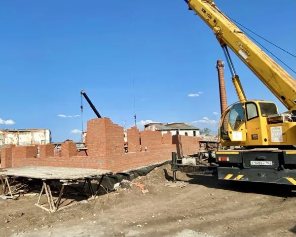 В настоящее время на объекте завершены работы по заливке фундамента, монтажу плит, перекрытию подвального помещения. Продолжается устройство наружных сетей. Строители начали кладку стен.